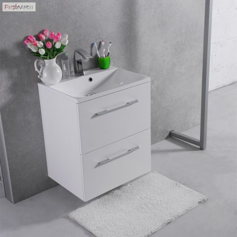 Тумба для ванної з умивальником Santorini 600 Fancy Marble чудово доповнить інтер'єр ванної кімнати і допоможе раціонально використовувати простір під раковиною і покращує естетичний вигляд в цілому. Тумба комплектується умивальником з литого штучного каменю моделі Amelia 600 і має дві висувні шухляди, які дозволяють зберігати різну побутову хімію і господарські дрібниці. Для підвішування вмонтовано два регульованих навіси, для підлогової установки додатково комплектується ніжками по вашому побажанню (ніжки в вартість комплекту не включені). Корпус і фасадні частини виготовлені з МДФ товщиною 16 мм, поверхня меблів покрита вологостійкою ПВХ-плівкою. Акуратна тумба виконана в класичному кольорі білий глянець, з можливістю виготовити в кольорі білий матовий і графіт матовий. Головною особливістю є динамічні лінії, прямокутні форми; довгасті металеві ручки; система «Soft close», яка забезпечує плавне і м'яке закривання. Fancy Marble - уособлення по-справжньому високої якості, витонченого дизайну і відмінною функціональності.
