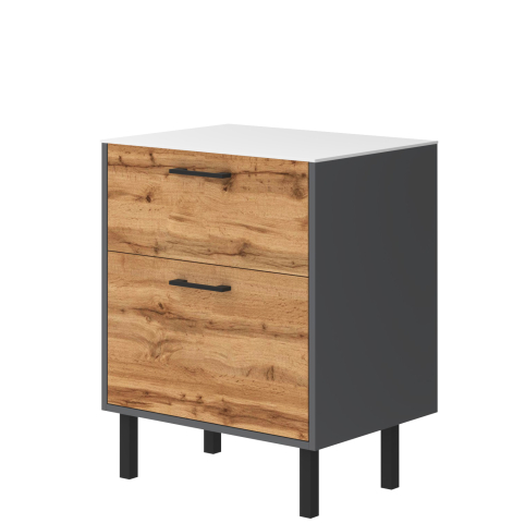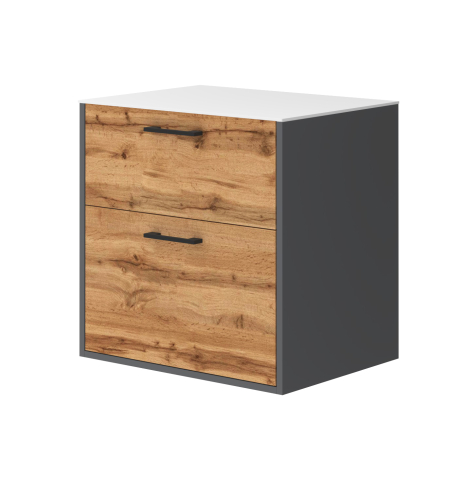 Тумба для ванної зі стільницею HPL 60 Afina антрацит / дуб вотан Ювента в елегантному та сучасному дизайні, що поєднують природні та індустріальні мотиви, перетворюючи вашу ванну кімнату на справжній витвір мистецтв, де кожен елемент продуманий до дрібниць, щоб дарувати вам задоволення щодня. Тумба зі стільницею з вологостійкого матеріалу HPL товщиною 6 мм (без отвору під умивальник, що підходить для будь-якого накладного умивальника) і в своїй конструкції має дві шухляди, які виготовлені з ламінованого ДСП товщиною 16 мм та встановлені на направляючі з функцією самодотягування часткового висування, Hafele. При цьому верхня шухляда має висоту 240 мм, а нижня шухляда вища, 334 мм, що дозволить вам зберігати всередині неї різну побутову хімію у високих пляшках. Також в конструкції тумби передбачено загальноприйняте та гармонізоване з усіма європейськими стандартами підведення та відведення води. З комплектом меблів для ванної Afina антрацит / дуб вотан Ювента ваша ванна кімната стане місцем, де практичність зустрічається з елегантністю, а кожен день сповнений комфортом і стилем. Дозвольте собі розкіш і функціональність, які надихають.