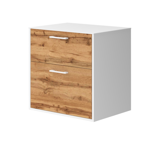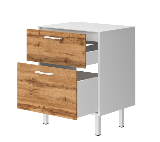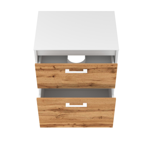 Тумба для ванної зі стільницею HPL 60 Afina білий / дуб вотан Ювента справжнє втілення стилю і витонченої елегантності, що перетворить буденну ванну кімнату на оазис комфорту та естетики, де кожен елемент продуманий до дрібниць, щоб дарувати вам задоволення щодня. Тумба зі стільницею з вологостійкого матеріалу HPL товщиною 6 мм (без отвору під умивальник, що підходить для будь-якого накладного умивальника) і в своїй конструкції має дві шухляди, які виготовлені з ламінованого ДСП товщиною 16 мм та встановлені на направляючі з функцією самодотягування часткового висування, Hafele. При цьому верхня шухляда має висоту 240 мм, а нижня шухляда вища, 334 мм, що дозволить вам зберігати всередині неї різну побутову хімію у високих пляшках. Також в конструкції тумби передбачено загальноприйняте та гармонізоване з усіма європейськими стандартами підведення та відведення води. Меблі для ванної Afina білий / дуб вотан Ювента - це відображення вашого стилю і турбота про ваш комфорт. З ними ваша ванна кімната стане місцем, де хочеться проводити більше часу, насолоджуючись кожною хвилиною.
