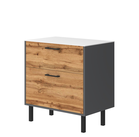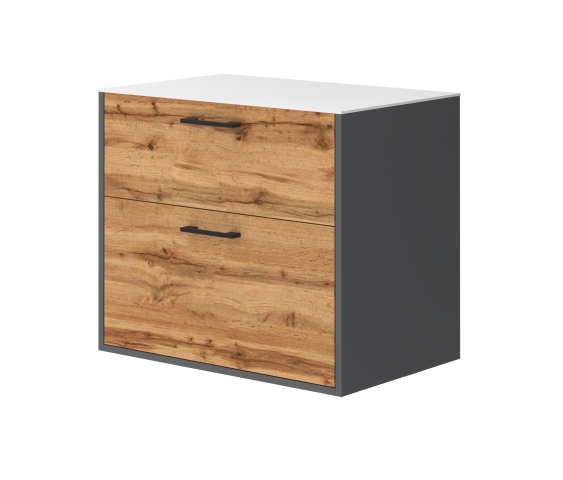Тумба для ванної зі стільницею HPL 70 Afina антрацит / дуб вотан Ювента в елегантному та сучасному дизайні, що поєднують природні та індустріальні мотиви, перетворюючи вашу ванну кімнату на справжній витвір мистецтв, де кожен елемент продуманий до дрібниць, щоб дарувати вам задоволення щодня. Тумба зі стільницею з вологостійкого матеріалу HPL товщиною 6 мм (без отвору під умивальник, що підходить для будь-якого накладного умивальника) і в своїй конструкції має дві шухляди, які виготовлені з ламінованого ДСП товщиною 16 мм та встановлені на направляючі з функцією самодотягування часткового висування, Hafele. При цьому верхня шухляда має висоту 240 мм, а нижня шухляда вища, 334 мм, що дозволить вам зберігати всередині неї різну побутову хімію у високих пляшках. Також в конструкції тумби передбачено загальноприйняте та гармонізоване з усіма європейськими стандартами підведення та відведення води. З комплектом меблів для ванної Afina антрацит / дуб вотан Ювента ваша ванна кімната стане місцем, де практичність зустрічається з елегантністю, а кожен день сповнений комфортом і стилем. Дозвольте собі розкіш і функціональність, які надихають.