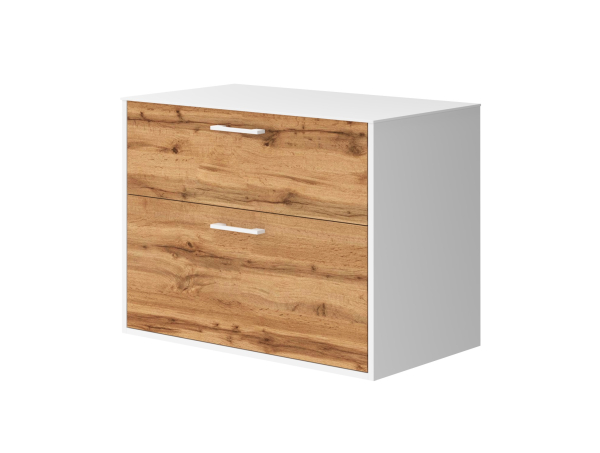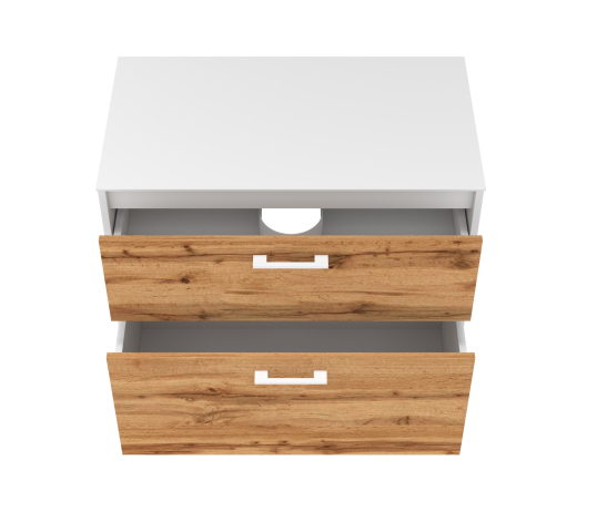 Тумба для ванної зі стільницею HPL 80 Afina білий / дуб вотан Ювента справжнє втілення стилю і витонченої елегантності, що перетворить буденну ванну кімнату на оазис комфорту та естетики, де кожен елемент продуманий до дрібниць, щоб дарувати вам задоволення щодня. Тумба зі стільницею з вологостійкого матеріалу HPL товщиною 6 мм (без отвору під умивальник, що підходить для будь-якого накладного умивальника) і в своїй конструкції має дві шухляди, які виготовлені з ламінованого ДСП товщиною 16 мм та встановлені на направляючі з функцією самодотягування часткового висування, Hafele. При цьому верхня шухляда має висоту 240 мм, а нижня шухляда вища, 334 мм, що дозволить вам зберігати всередині неї різну побутову хімію у високих пляшках. Також в конструкції тумби передбачено загальноприйняте та гармонізоване з усіма європейськими стандартами підведення та відведення води. Меблі для ванної Afina білий / дуб вотан Ювента - це відображення вашого стилю і турбота про ваш комфорт. З ними ваша ванна кімната стане місцем, де хочеться проводити більше часу, насолоджуючись кожною хвилиною.