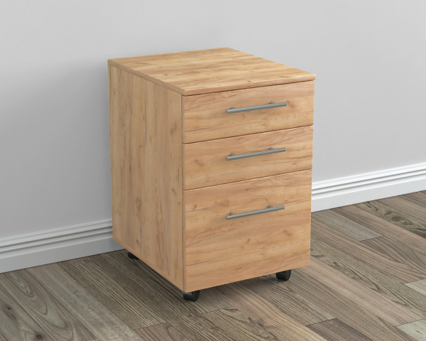 Мобільна тумба L-420 Loft Design - відмінний варіант тумби, як для офісу, так і для дому. Тумба виконана з преміального ЛДСП серії Wood товщиною 18 мм. На робочих поверхнях використовується кромка ПВХ товщиною 2 мм. Мобільна тумба має три висувних ящика. Два меньших, і один великий. У великий ящик зручно складати особисті великі речі: взуття, сумки, головні убори. Ящики висуваються на роликових напрямних. Для зручності переміщення мобільна тумба оснащена прогумованими коліщатками. Ящики комплектуються металевими ручками. Тумба буде відмінно доповнювати будь-яку з моделей письмових столів виробництва Loft Design.
