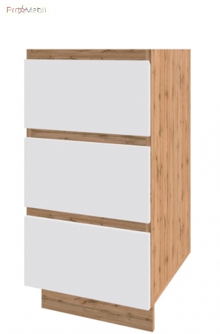 Досить містка нижня тумба НШ40 Софт Сокме чудово підійде для зберігання різної кухонного приладдя - різних столових приладів, посуду або інгредієнтів. Тумба нижня містить три висувні шухляди. Стільниця комплектується та продається окремо. Корпус і фасади виготовляються з якісного ДСП товщиною 16 мм в цікавому поєднанні кольорів: корпус виконаний в кольорі «дуб вотан» максимально наближеному до текстури натуральної деревини, фасади білого кольору підкреслюють текстуру деревини корпусу і додають кухні сучасного характеру. Торцеві поверхні всіх внутрішніх і зовнішніх елементів виробів облицьовані крайкою ABS товщиною 0,5 мм і крайкою ПВХ товщиною 0,5 мм, надаючи меблям завершений гарний і доглянутий вигляд. Колекція привертає увагу лаконічним і стриманим дизайном; мінімалістичним стилем; поєднанням білого з яскраво вираженою текстурою деревини; відсутністю ручок, їх роль виконує фрезерований торець фасаду під кутом 45 градусів; міцними ніжками, що сприяють максимальної стійкості з цокольними планками, які комплектуються силіконовим профілем, запобігаючи потраплянню вологи і бруду; фірмовими комплектуючими: телескопічними напрямними і завісами без дотягу Hafele, які забезпечують максимальний комфорт у використанні. Кухня Софт Сокме - прикрасить сучасний інтер'єр, стане душею будинку, де збирається вся родина не тільки за сніданками або вечерями, але і для обговорення різних тем.