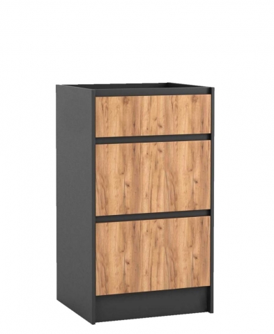 Нижня тумба Н30Ш кухня Графіті Світ Меблів є чудовим дизайнерським рішенням у стилі лофт з енергетикою брутальної практичності, красою натуральних матеріалів та при цьому 100 відсотків функціональністю в інтер'єрі. Тумба нижня містить три висувні шухляди з телескопічними направляючими повного висування та чудово підійде для зберігання різної кухонного приладдя - різних столових приладів, посуду або інгредієнтів. Стільниця комплектується та продається окремо. Корпус та фасади виготовляються з якісного ламінованого ДСП з використанням натуральних кольорів та фактур у поєднанні графітового корпусу та фасадів у кольорі дуб крафт золотий. Кухня Графіті Світ Меблів допоможе отримати оригінальний інтер'єр кухні, на перший погляд, грубуватий, але водночас затишний та практичний. Кухня в стилі лофт відмінно підійде тим, хто втомився від шаблонних інтер'єрів.