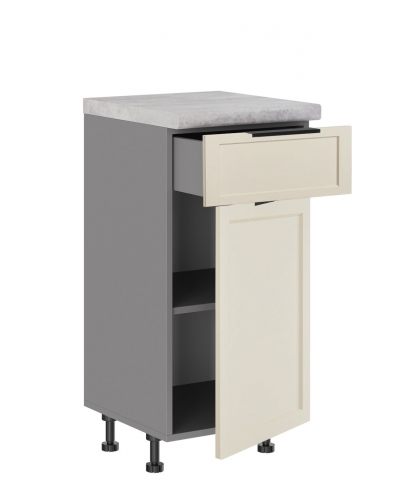 Нижня кухонна тумба Н40ДШ кухня Анна Світ Меблів допоможе грамотно спланувати кухонний простір: і вільного місця буде більше, і господині зручно готувати та сформує додаткову зону для зберігання кухонного інвентарю на кухні. Дана конструкція оснащена одним закритим відділенням з поличкою всередині та однією висувною шухлядою з роликовими направляючими, де можна розмістити різне кухонне приладдя, посуд, техніку і багато чого іншого. Стільниця комплектується та продається окремо. Додатково до тумби можна замовляти цокольні планки, які запобігають попаданню вологи та бруду, або регульовані ніжки у кольорі алюміній замість царги. Корпус виготовляється з якісного ламінованого ДСП у популярних кольорових рішеннях на вибір «білий», «дуб сонома», «графіт», «попелястий» та «дуб крафт золотий» з фасадами з фарбованого МДФ у кольорових рішеннях на вибір «айворі», «аквамарин темний», «балі зелений», «білий шовк», «графіт», «капучіно», «кораловий», «червоний», «лаванда», «м'ята», «нефрит», «пломбірі», «пудровий», «сірий оксамит», «шоколад». Унікальна кухня Анна Світ Меблів дозволить Вам спроектувати кухню, використовуючи її потенціал таким чином, щоб повсякденне приготування їжі приносило задоволення.