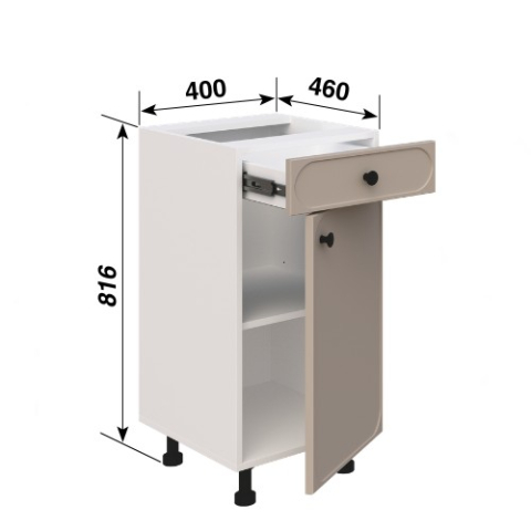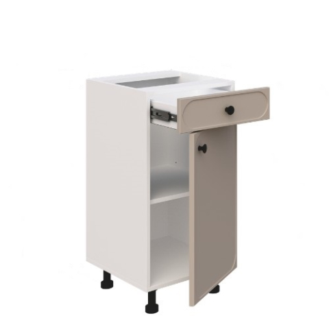 Нижня тумба Н40ДШ Lux кухня Сью від Світ Меблів - стриманий і функціональний елемент, який легко вписується в гармонійний кухонний простір. Всередині продумано все для зручного зберігання: закрите відділення з полицею підходить для більш об'ємного посуду та техніки, а висувний ящик дозволяє організувати дрібні предмети так, щоб вони завжди були під рукою. Телескопічні напрямні повного висунення забезпечують плавне відкриття та повний доступ до вмісту, роблячи щоденне використання особливо комфортним. Стільниця комплектується та продається окремо. Додатково модуль може комплектуватися цокольними планками для захисту від вологи та забруднень або встановлюватися на регульовані ніжки в кольорі алюмінію замість царги, що спрощує монтаж і робить конструкцію більш гнучкою. Корпус виконаний з якісного ламінованого ДСП у відтінках «білий», «дуб сонома», «попелястий», «графіт» і «дуб крафт золотий», а фасади з фарбованого МДФ доступні в широкій палітрі кольорів «білий шовк», «пломбір», «айворі», «мокко», «лате», «сірий оксамит», «попіл», «світла м'ята», «блакитний лід», «морська бірюза», «аквамарин темний», «синій електрик», «м'ята», «насичена оливка», «балі зелений», «жовтий промінь», «лаванда», «графіт» і «капучино», що дозволяє легко підібрати модуль в єдиному стилі кухні. Делікатно заокруглена рамка фасаду додає м'якості лініям, а матова ручка-кнопка в чорному кольорі підкреслює сучасний характер і акуратно розставляє контрастні акценти. Кухня Сью Світ Меблів - простір, де кожен елемент працює на відчуття легкості, порядку і тихого, повсякденного комфорту.
