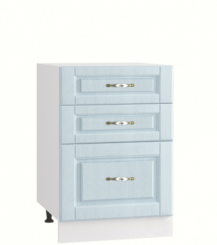 Компактна підлогова тумба Н40Ш кухня Прованс Світ Меблів - елемент нижнього ярусу модульної кухні, підійде для зберігання різної кухонного приладдя - різних столових приладів, посуду або інгредієнтів. Тумба нижня містить три висувні шухляди з роликовими направляючими. Стільниця комплектується та продається окремо. Додатково до тумби можна замовляти цокольні планки, які запобігають попаданню вологи та бруду, або регульовані ніжки у кольорі алюміній замість царги. Корпус виготовляється з якісного ламінованого ДСП у популярних колірних рішеннях «білий», «дуб сонома» та «графіт» з текстурним фасадом із МДФ з фрезерованим малюнком у ніжному відтінку «блакитна лагуна». Кухня Прованс блакитна лагуна Світ Меблів досить цікаве та оригінальне рішення для сміливих та впевнених у собі людей, яка ніколи не здаватиметься нудною та буденною, адже блакитний колір привертає увагу та запам'ятовується.