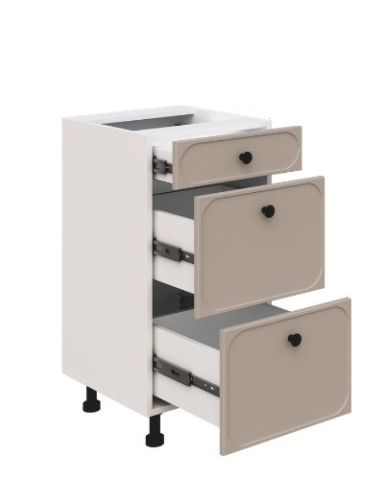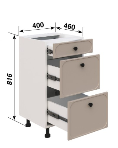 Нижня тумба Н40Ш Lux кухня Сью Світ Меблів - акуратний модуль із продуманою внутрішньою організацією, який додає кухні відчуття порядку та візуальної легкості. Стриманий характер легко вписується в загальний ансамбль, роблячи простір більш зібраним і зручним для повсякденних завдань. В основі конструкції - три висувні ящики, які відкриваються плавно і повністю, завдяки телескопічним направляючим повного висунення. Таке рішення дозволяє бачити вміст цілком і використовувати глибину ящиків без обмежень. Тут зручно розмістити столові прибори, кухонні дрібниці, посуд або упаковки з продуктами - все залишається на своїх місцях і завжди під рукою. Стільниця комплектується та продається окремо. Додатково модуль може комплектуватися цокольними планками для захисту від вологи та забруднень або встановлюватися на регульовані ніжки в кольорі алюмінію замість царги, що спрощує монтаж і робить конструкцію більш гнучкою. Корпус виконаний з якісного ламінованого ДСП у відтінках «білий», «дуб сонома», «попелястий», «графіт» і «дуб крафт золотий», а фасади з фарбованого МДФ доступні в широкій палітрі кольорів «білий шовк», «пломбір», «айворі», «мокко», «лате», «сірий оксамит», «попіл», «світла м'ята», «блакитний лід», «морська бірюза», «аквамарин темний», «синій електрик», «м'ята», «насичена оливка», «балі зелений», «жовтий промінь», «лаванда», «графіт» і «капучино», що дозволяє легко підібрати модуль в єдиному стилі кухні. Делікатно заокруглена рамка фасаду додає м'якості лініям, а матова ручка-кнопка в чорному кольорі підкреслює сучасний характер і акуратно розставляє контрастні акценти. Кухня Сью Світ Меблів - простір, де кожен елемент працює на відчуття легкості, порядку і тихого, повсякденного комфорту.