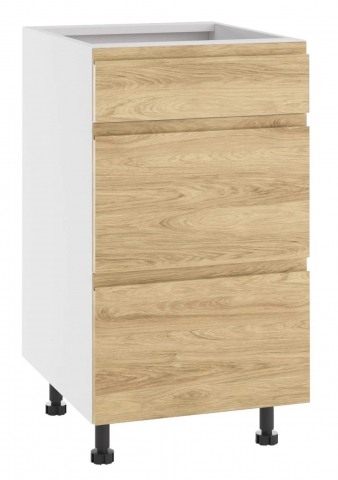 Нижня кухонна тумба Н40Ш LUX кухня Тіна Світ Меблів стане вигідним рішенням та створить у приміщенні досить гармонійний та оригінальний дизайн, при цьому простір кухні стане більш зручним, комфортним та практичним, що важливо для дизайну кухонного простору та створення зони вільного пересування. Тумба нижня містить три висувні шухляди з телескопічними направляючими повного висування, що чудово підійде для зберігання різної кухонного приладдя - різних столових приладів, посуду або інгредієнтів. Стільниця комплектується та продається окремо. Додатково до тумби можна замовляти цокольні планки, які запобігають попаданню вологи та бруду, або регульовані ніжки у кольорі алюміній замість царги. Корпус виготовляється з якісного ламінованого ДСП Kronospan товщиною 16 мм у популярних кольорових рішеннях на вибір «білий», «дуб сонома», «графіт», «попелястий» та «дуб крафт золотий» з фасадами з якісного ламінованого ДСП Kronospan товщиною 18 мм у кольорових рішеннях на вибір «ательє світлий», «білий», «глиняний сірий», «дуб королівський», «дуб сільверджек вінтажний», «зелений димчастий», «іриска», «кашемір», «сахара», «сіра мишка», «сутінковий блакитний». Тіна Світ Меблів це спосіб надати вашій кухні неперевершеної елегантності та стилю, ставши чудовою основою для створення теплого та затишного оточення у вашому будинку.