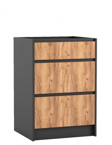 Нижня тумба Н50Ш кухня Графіті Світ Меблів є чудовим дизайнерським рішенням у стилі лофт з енергетикою брутальної практичності, красою натуральних матеріалів та при цьому 100 відсотків функціональністю в інтер'єрі. Тумба нижня містить три висувні шухляди з телескопічними направляючими повного висування та чудово підійде для зберігання різної кухонного приладдя - різних столових приладів, посуду або інгредієнтів. Стільниця комплектується та продається окремо. Корпус та фасади виготовляються з якісного ламінованого ДСП з використанням натуральних кольорів та фактур у поєднанні графітового корпусу та фасадів у кольорі дуб крафт золотий. Кухня Графіті Світ Меблів допоможе отримати оригінальний інтер'єр кухні, на перший погляд, грубуватий, але водночас затишний та практичний. Кухня в стилі лофт відмінно підійде тим, хто втомився від шаблонних інтер'єрів.