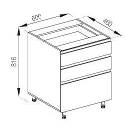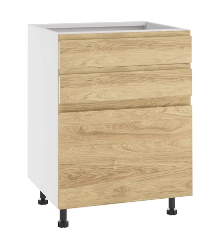 Нижня кухонна тумба Н60 3Ш (2+1) кухня Тіна Світ Меблів стане вигідним рішенням та створить у приміщенні досить гармонійний та оригінальний дизайн, при цьому простір кухні стане більш зручним, комфортним та практичним, що важливо для дизайну кухонного простору та створення зони вільного пересування. Тумба нижня містить три висувні шухляди з роликовими направляючими, чудово підійде для зберігання різної кухонного приладдя - різних столових приладів, посуду або інгредієнтів. Стільниця комплектується та продається окремо. Додатково до тумби можна замовляти цокольні планки, які запобігають попаданню вологи та бруду, або регульовані ніжки у кольорі алюміній замість царги. Корпус виготовляється з якісного ламінованого ДСП Kronospan товщиною 16 мм у популярних кольорових рішеннях на вибір «білий», «дуб сонома», «графіт», «попелястий» та «дуб крафт золотий» з фасадами з якісного ламінованого ДСП Kronospan товщиною 18 мм у кольорових рішеннях на вибір «ательє світлий», «білий», «глиняний сірий», «дуб королівський», «дуб сільверджек вінтажний», «зелений димчастий», «іриска», «кашемір», «сахара», «сіра мишка», «сутінковий блакитний». Тіна Світ Меблів це спосіб надати вашій кухні неперевершеної елегантності та стилю, ставши чудовою основою для створення теплого та затишного оточення у вашому будинку.