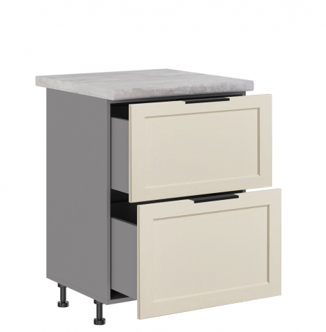 Нижня кухонна тумба Н60Ш кухня Анна Світ Меблів допоможе грамотно спланувати кухонний простір: і вільного місця буде більше, і господині зручно готувати та сформує додаткову зону для зберігання кухонного інвентарю на кухні. Дана конструкція оснащена двома висувними шухлядами з роликовими направляючими, де можна розмістити різне кухонне приладдя, посуд, техніку і багато чого іншого. Стільниця комплектується та продається окремо. Додатково до тумби можна замовляти цокольні планки, які запобігають попаданню вологи та бруду, або регульовані ніжки у кольорі алюміній замість царги. Корпус виготовляється з якісного ламінованого ДСП у популярних кольорових рішеннях на вибір «білий», «дуб сонома», «графіт», «попелястий» та «дуб крафт золотий» з фасадами з фарбованого МДФ у кольорових рішеннях на вибір «айворі», «аквамарин темний», «балі зелений», «білий шовк», «графіт», «капучіно», «кораловий», «червоний», «лаванда», «м'ята», «нефрит», «пломбірі», «пудровий», «сірий оксамит», «шоколад». Унікальна кухня Анна Світ Меблів дозволить Вам спроектувати кухню, використовуючи її потенціал таким чином, щоб повсякденне приготування їжі приносило задоволення.