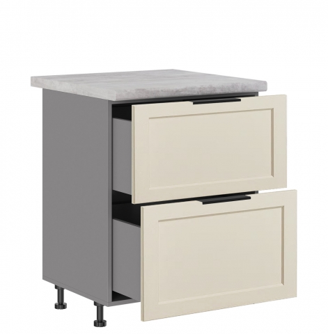 Нижня кухонна тумба Н80Ш кухня Анна Світ Меблів допоможе грамотно спланувати кухонний простір: і вільного місця буде більше, і господині зручно готувати та сформує додаткову зону для зберігання кухонного інвентарю на кухні. Дана конструкція оснащена двома висувними шухлядами з роликовими направляючими, де можна розмістити різне кухонне приладдя, посуд, техніку і багато чого іншого. Стільниця комплектується та продається окремо. Додатково до тумби можна замовляти цокольні планки, які запобігають попаданню вологи та бруду, або регульовані ніжки у кольорі алюміній замість царги. Корпус виготовляється з якісного ламінованого ДСП у популярних кольорових рішеннях на вибір «білий», «дуб сонома», «графіт», «попелястий» та «дуб крафт золотий» з фасадами з фарбованого МДФ у кольорових рішеннях на вибір «айворі», «аквамарин темний», «балі зелений», «білий шовк», «графіт», «капучіно», «кораловий», «червоний», «лаванда», «м'ята», «нефрит», «пломбірі», «пудровий», «сірий оксамит», «шоколад». Унікальна кухня Анна Світ Меблів дозволить Вам спроектувати кухню, використовуючи її потенціал таким чином, щоб повсякденне приготування їжі приносило задоволення.