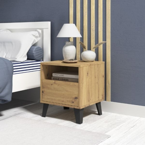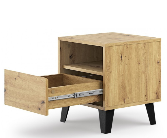Тумба приліжкова 1S Borg дуб артізан Mebel Bos - виразна і стильна, створена з урахуванням Ваших потреб, ритму життя та індивідуального смаку, щоб гармонійно вписатися в спокійну спальню або яскраву дитячу кімнату, надаючи простору особливого акценту, наповнюючи його теплом, практичною елегантністю і атмосферою продуманого комфорту. Тумба приліжкова містить одну висувну шухляду і відкриту поличку, забезпечуючи зручне зберігання необхідних дрібниць і легкий доступ до них. Корпус і фасадні елементи виготовлені з міцного ламінованого ДСП товщиною 16 мм, у теплому відтінку дуб артізан. Особлива увага приділена деталям: чіткі геометричні форми підкреслюють характер комода і його сучасне звучання, відсутність ручок компенсується витонченими фрезерованими виїмками, які додають фасадам оригінальності та чистоти ліній, високі, витончені ніжки надають візуальну легкість, наче комод майорить над підлогою, водночас зберігаючи високу стійкість, а якісна фурнітура забезпечує м'якість і плавність у використанні. Borg Mebel Bos - меблі з характером, що створюють завершений образ приміщення, наповнюють простір затишком, відчуттям порядку і натхнення, стають невід'ємною частиною вашого будинку і відображають ваше прагнення до стилю, функціональності та естетики в кожній деталі.