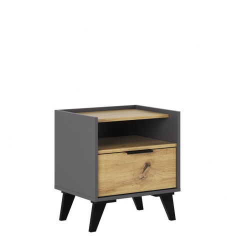 Тумба приліжкова Каміла Світ Меблів, що зачаровує вишуканою простотою та витонченістю, для облаштування інтер'єру спальні. Тумба містить одну висувну шухляду та одну відкриту нішу. Меблі привертають увагу неповторною аскетичністю; контрастним поєднанням графітового корпусу з вираженими фасадами з фактурою дерева "дуб артізан"; строгими і прямими лініями; довгастими ручками, інтегрованими в край фасаду; стійкими високими ніжками; фірмовими комплектуючими, які забезпечують максимальний комфорт у використанні. Меблі Каміла Світ Меблів - це ідеальне рішення для тих, хто віддає перевагу простоті та надійності, кому подобаються естетичні та креативні рішення.