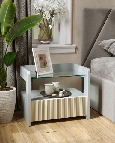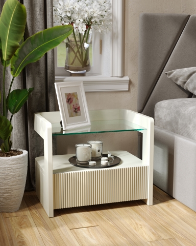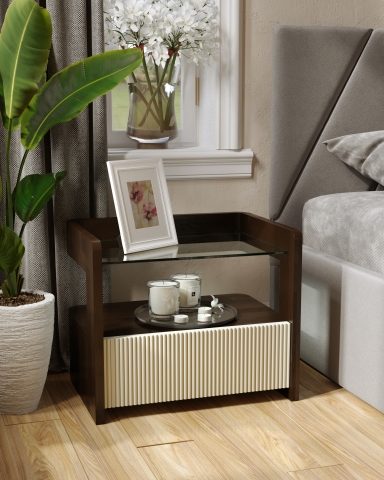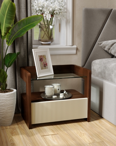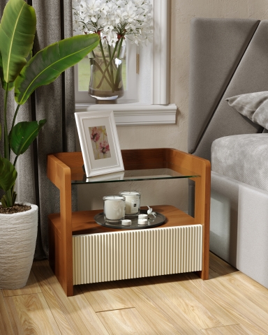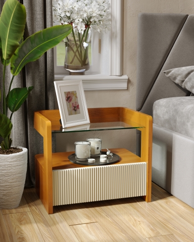 Тумба приліжкова Ідеал Арбор Древ з натурального дерева вищого гатунку, виготовлена українською фабрикою Арбор Древ. Тумба гармонійно впишеться в інтер'єр спальні і дитячої, і стане корисним функціональним предметом меблів, що дозволяє розмістити необхідні речі. Внутрішній простір тумби заповнено однією висувною шухлядою та відкритою нішею. Приліжкова тумбочка виконана з натурального дерева бука або сосни на вибір, і покрито гіпоалергенним лаком італійського виробництва, поличка із загартованого скла товщиною 4 мм. Головними рисами тумби є сучасний дизайн; оригінальна фактура, виконана самою природою; прості прямокутні форми; відсутність ручок, їх роль виконує торець фасаду; міцна основа, що сприяє максимальній стійкості; фірмові комплектуючі телескопічні напрямні повного висуву.