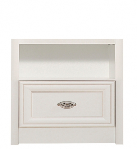 Тумба приліжкова КОМ1S Салерно Gerbor створений на основі останніх тенденцій в італійському дизайні для облаштування інтер'єру молодіжної кімнати та комфортної спальні. Тумба містить одну відкриту нішу та одну висувну шухляду. Меблі характеризуються цікавими дизайнерськими рішеннями: простотою конструкції з нотками італійської розкоші; ніжним білим кольором із патинованими рамковими фасадами, що створюють додатковий об'єм і виразність, надаючи меблям вишуканого й елегантного вигляду; оригінальними металевими ручками у формі "черепашки", що додають унікальності; міцною основою, яка сприяє максимальній стійкості; фірмовими комплектуючими. Меблі Салерно Гербор допоможуть створити затишний і стильний простір у вашому домі.