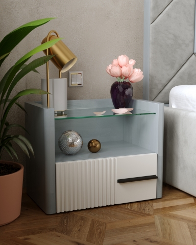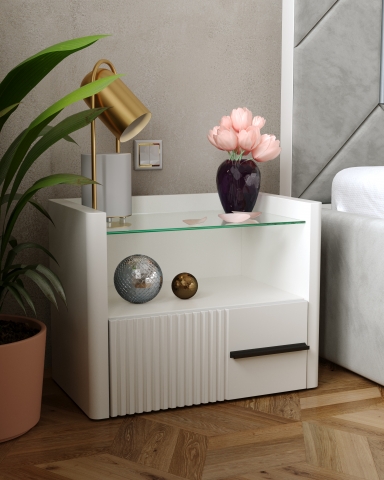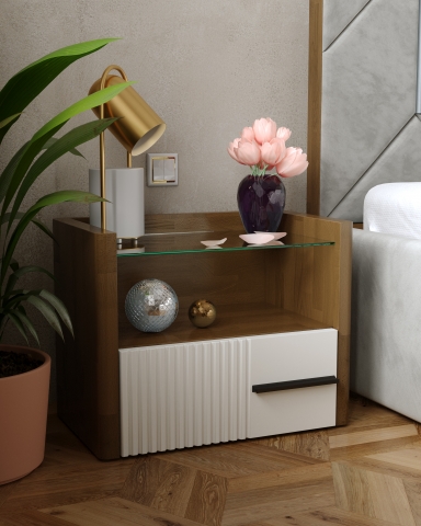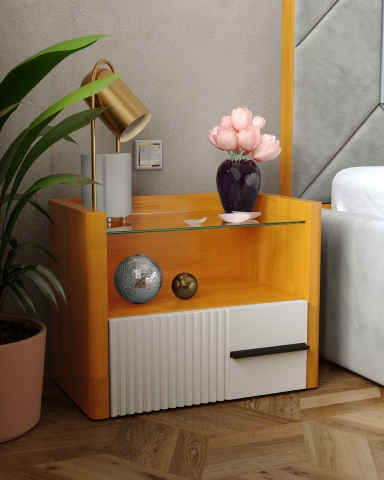 Тумба приліжкова Модерн Арбор Древ з натурального дерева вищого гатунку, виготовлена українською фабрикою Арбор Древ. Тумба гармонійно впишеться в інтер'єр спальні і дитячої, і стане корисним функціональним предметом меблів, що дозволяє розмістити необхідні речі. Внутрішній простір тумби заповнено однією висувною шухлядою та відкритою нішею. Приліжкова тумбочка виконана з натурального дерева бука або сосни на вибір, і покрито гіпоалергенним лаком італійського виробництва, поличка із загартованого скла товщиною 4 мм. Головними рисами тумби є сучасний дизайн; оригінальна фактура, виконана самою природою; прості прямокутні форми; довгасті ручки; міцна основа, що сприяє максимальній стійкості; фірмові комплектуючі телескопічні напрямні повного висуву.