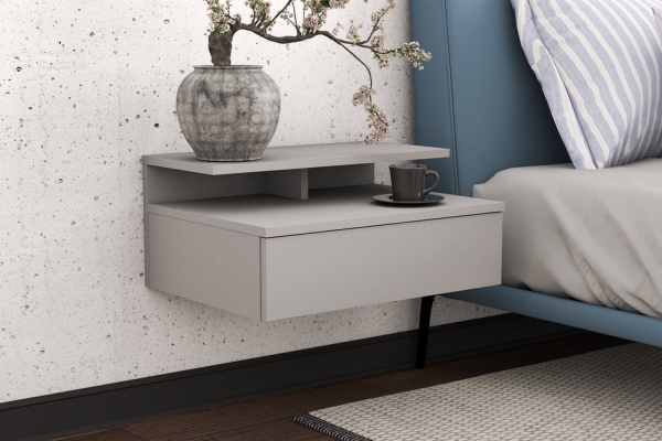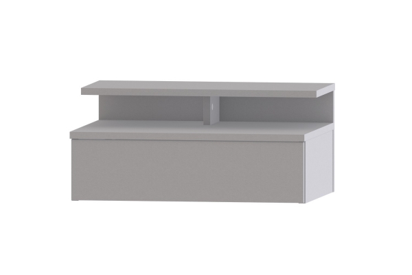 Компактна підвісна приліжкова тумба Кіра Світ Меблів для спальні, що заощаджує місце, - це незамінний аксесуар, який додасть комфорту і затишку у Ваш інтер'єр. Тумба містить відкриту нішу і одну висувну шухляду, що дасть змогу Вам зберігати аксесуари, які часто необхідні перед сном. Це можуть бути книги, окуляри, пульт від телевізора чи кондиціонера тощо. Корпус і фасадні частини виготовляються з якісного ламінованого ДСП товщиною 16 мм у привабливому кольоровому виконанні попелястий глянець. Завдяки навісній конструкції, приліжкова тумбочка є чудовим рішенням для зберігання, не займаючи при цьому площу підлоги.
