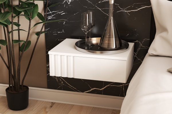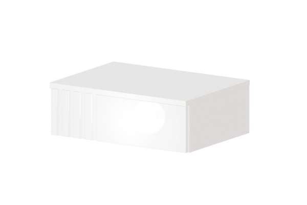 Компактна підвісна приліжкова тумба Ліна Світ Меблів для спальні, що заощаджує місце, - це незамінний аксесуар, який додасть комфорту і затишку у Ваш інтер'єр. Тумба містить одну висувну шухляду, що дасть змогу Вам зберігати аксесуари, які часто необхідні перед сном. Це можуть бути книги, окуляри, пульт від телевізора чи кондиціонера тощо. Корпус виготовляється з якісного ламінованого ДСП товщиною 16 мм, фасад з ламінованого МДФ товщиною 16 мм у привабливому поєднанні кольорів білий / білий глянець. Завдяки навісній конструкції, приліжкова тумбочка є чудовим рішенням для зберігання, не займаючи при цьому площу підлоги.