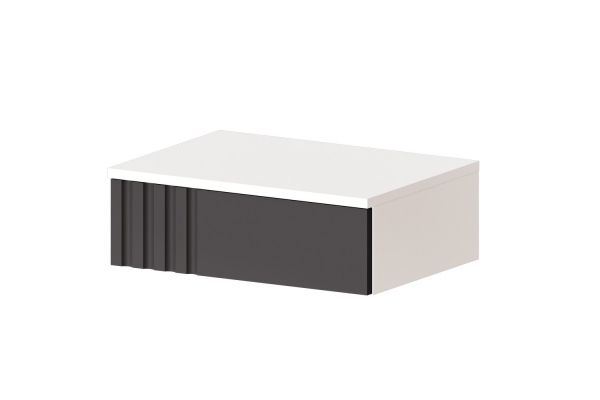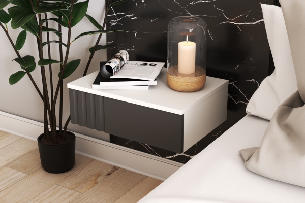 Компактна підвісна приліжкова тумба Ліна Світ Меблів для спальні, що заощаджує місце, - це незамінний аксесуар, який додасть комфорту і затишку у Ваш інтер'єр. Тумба містить одну висувну шухляду, що дасть змогу Вам зберігати аксесуари, які часто необхідні перед сном. Це можуть бути книги, окуляри, пульт від телевізора чи кондиціонера тощо. Корпус виготовляється з якісного ламінованого ДСП товщиною 16 мм, фасад з ламінованого МДФ товщиною 16 мм у привабливому поєднанні кольорів білий / графіт. Завдяки навісній конструкції, приліжкова тумбочка є чудовим рішенням для зберігання, не займаючи при цьому площу підлоги.
