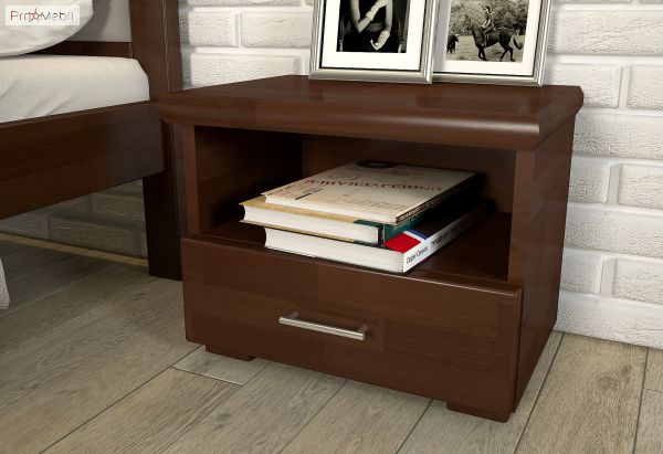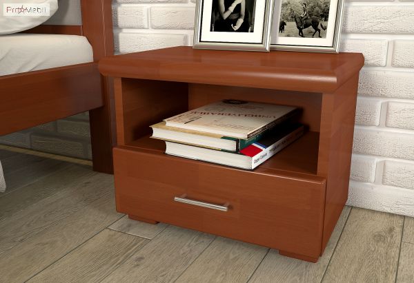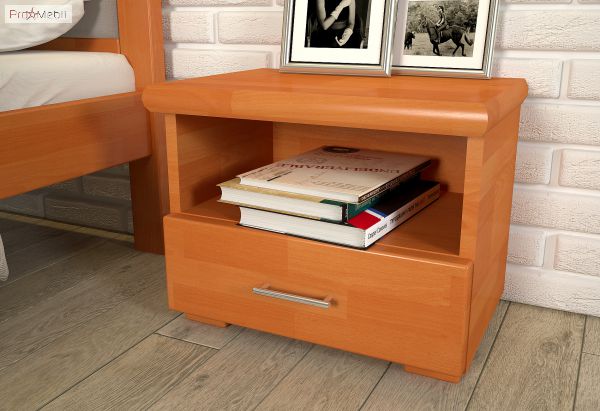 Тумба приліжкова Стандарт Арбор Древ з натурального дерева вищого гатунку, виготовлена українською фабрикою Арбор Древ. Тумба гармонійно впишеться в інтер'єр спальні і дитячої, і стане корисним функціональним предметом меблів, що дозволяє розмістити необхідні речі. Внутрішній простір тумби заповнено однією висувною шухлядою та однією відкритою нішею. Приліжкова тумбочка виконана з натурального дерева бука або сосни на вибір, і покрито гіпоалергенним лаком італійського виробництва, каркас шухляди - ламіноване ДСП, задня стінка та днище шухляди – ДВП. Головними рисами тумби є сучасний дизайн; оригінальна фактура, виконана самою природою; прості прямокутні форми; довгасті хромовані ручки; міцна основа, що сприяє максимальній стійкості; фірмові комплектуючі телескопічні напрямні повного висуву.