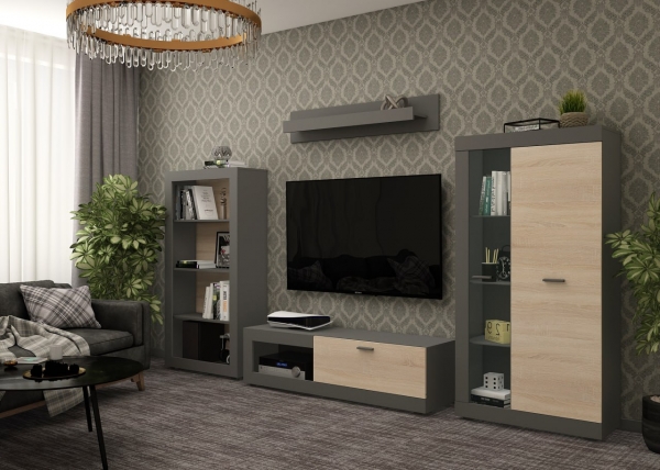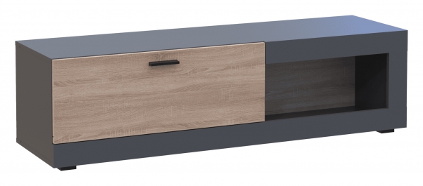 Витончена ТВ тумба 1 / 1 ДСП Дана Doros, допоможе створити простір, який буде візуально привабливим та зручним для всіх, хто відвідує вітальню. Тумба під телевізор містить одне закрите відділення з відкидними дверцятами та одну відкриту нішу, що дозволить встановити телевізора і DVD-плеєр, а також знайдеться місце для зберігання DVD-дисків, пульта, газет, журналів і різних побутових дрібниць. Тумба виготовляється з ламінованого ДСП (Kronospan) товщиною 16 мм у поєднанні протилежних відтінків: елегантного та загадкового кольору "графіт" з теплим та заспокійливим відтінком деревної текстури "дуб сонома". Модульні меблі Дана Doros поєднує різні елементи, створюючи унікальний та неповторний інтер'єр.