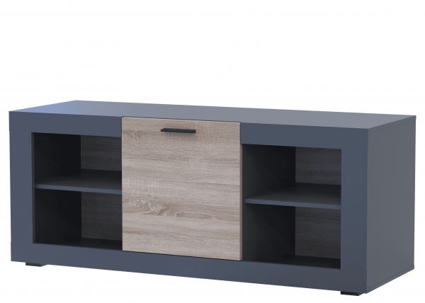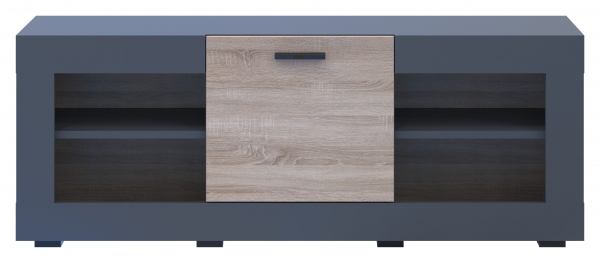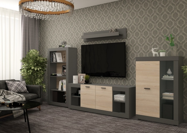 Витончена ТВ тумба 1 двері / 1 ДСП Дана Doros, допоможе створити простір, який буде візуально привабливим та зручним для всіх, хто відвідує вітальню. Тумба під телевізор містить одне закрите відділення та відкриті ніші, що дозволить встановити телевізора і DVD-плеєр, а також знайдеться місце для зберігання DVD-дисків, пульта, газет, журналів і різних побутових дрібниць. Тумба виготовляється з ламінованого ДСП (Kronospan) товщиною 16 мм у поєднанні протилежних відтінків: елегантного та загадкового кольору "графіт" з теплим та заспокійливим відтінком деревної текстури "дуб сонома". Модульні меблі Дана Doros поєднує різні елементи, створюючи унікальний та неповторний інтер'єр.