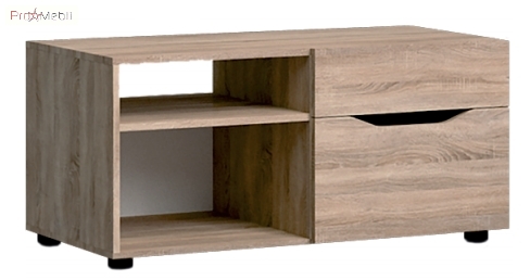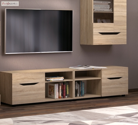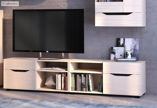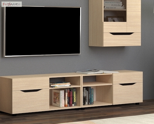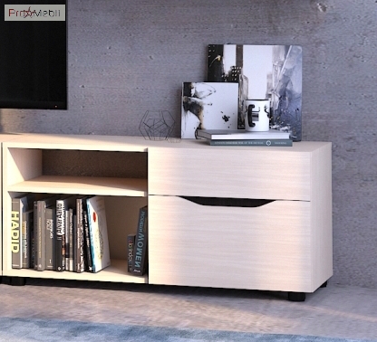 ТВ тумба Аякс Майстер Форм чудово доповнить інтер'єр вітальні і дозволить не тільки з зручністю розмістити необхідну техніку, а й надасть місце для зберігання речей, а також тумба створить додатковий простір для документів, варто тільки поставити тумбу під стіл. Тумба містить одну висувну шухляду, одне закрите відділення і відкриті полиці. Для зручності тумба може бути як правосторонньою, так і лівосторонньою. Корпус і фасадні частини виготовлені з якісного ламінованого ДСП, в безпрограшному поєднанні світлих і темних відтінків: дуб молочний або дуб сонома з венге магія. Торцеві поверхні всіх внутрішніх і зовнішніх елементів виробів облицьовані пластиковою кромкою, надаючи меблям завершений гарний і доглянутий вигляд. Меблі Аякс Майстер Форм привертають увагу своїм легким і сучасним дизайном; простими прямокутними формами; застосуванням двокольорової гами; відсутністю традиційних ручок для відкривання, їх роль виконують виїмки в фасаді, декоровані з внутрішнього боку контрастною планкою; пластиковими регульованими ніжками; фірмовими комплектуючими: телескопічними напрямними і фірмовими завісами, які забезпечують максимальний комфорт у використанні. Меблі Аякс Майстер Форм чудово прикрасять інтер'єр Вашого будинку і дозволять підкреслити Вашу індивідуальність.