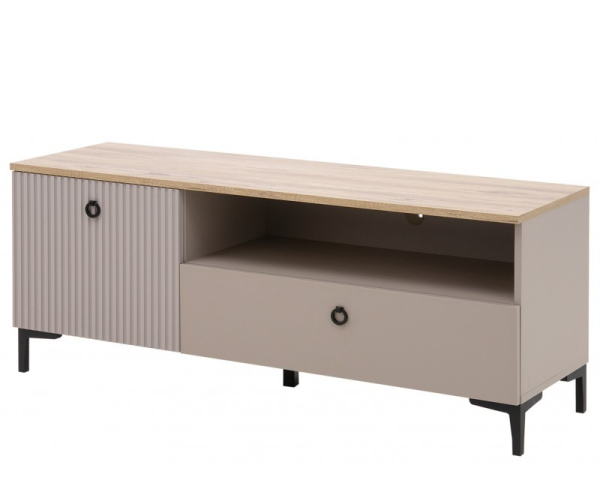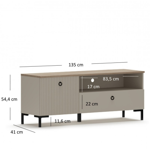 ТВ тумба 1K1S Dominica Mebel Bos справжній шедевр витонченого стилю й елегантності, що ідеально підходить для створення затишної та функціональної атмосфери у вітальні. ТВ-тумба оснащена однією висувною шухлядою, закритим відділенням з фасадом, що відчиняється донизу, і відкритою нішею з технічним отвором для дротів на задній стінці. Тумба приваблює своїм сучасним мінімалізмом; гладким корпусом з ребристими фасадами, що створюють тактильну глибину; чорними металевими ручками-кнокерами, що додають індустріальний шарм; Г-подібними пластиковими ніжками - легкість та міцність, а фірмові комплектувальні, кулькові напрямні повного висування та петлі, забезпечують довговічність та функціональність меблів. Колекція Домініка Меблі Бос - це комплексне рішення для створення затишного і сучасного інтер'єру з акцентом на стиль і практичність.