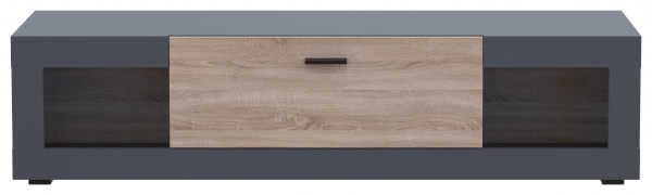 Витончена ТВ тумба 2 / 1 ДСП Дана Doros, допоможе створити простір, який буде візуально привабливим та зручним для всіх, хто відвідує вітальню. Тумба під телевізор містить одне закрите відділення з відкидними дверцятами та дві відкриті ніші, що дозволить встановити телевізора і DVD-плеєр, а також знайдеться місце для зберігання DVD-дисків, пульта, газет, журналів і різних побутових дрібниць. Тумба виготовляється з ламінованого ДСП (Kronospan) товщиною 16 мм у поєднанні протилежних відтінків: елегантного та загадкового кольору "графіт" з теплим та заспокійливим відтінком деревної текстури "дуб сонома". Модульні меблі Дана Doros поєднує різні елементи, створюючи унікальний та неповторний інтер'єр.