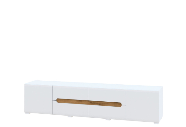 ТВ-тумба 2.3 Бьянко Світ Меблів, наповнена сяйвом витонченого стилю, поєднує сучасну естетику, функціональність і вишуканість у кожній деталі, створюючи в будинку атмосферу натхнення, затишку і візуальної гармонії. Тумба під телевізор включає чотири висувні шухляди і два закритих відділення з полицею в кожному, забезпечуючи зручне зберігання і підтримуючи охайний зовнішній вигляд простору. Колекція привертає увагу продуманим дизайном, лаконічними формами і чистими лініями, витонченими фасадами з вишуканим геометричним фрезеруванням, плавними закругленими краями і відсутністю звичних ручок, роль яких виконують акуратні фрезеровані виїмки з контрастними двосторонніми вставками, де одна сторона виконана в глибокому чорному кольорі, а інша в благородному відтінку дуб аппалачі, що при збірці дозволяє вибрати відповідний варіант оформлення, підкресливши характер інтер'єру і додавши йому індивідуальності, виразності і особливого шарму, стійкі квадратні ніжки надають конструкції візуальну солідність і сучасний характер, а якісна фурнітура завершує композицію, об'єднуючи естетику і комфорт в єдиному гармонійному образі. Бьянко Світ Меблів - мистецтво жити красиво, поєднуючи естетику, комфорт і сучасні технології, створюючи простір, в якому вам буде приємно перебувати кожен день!