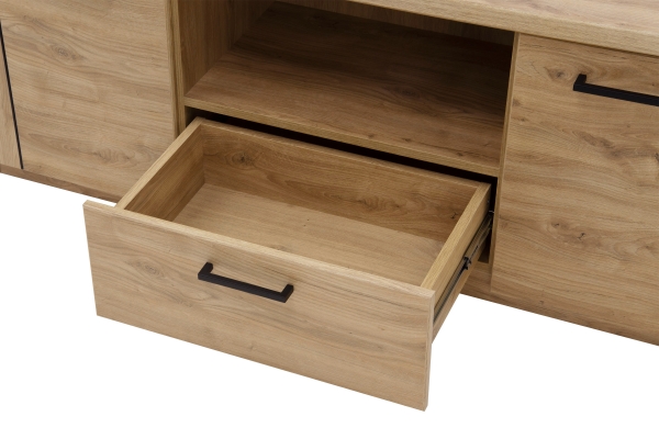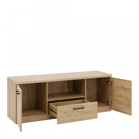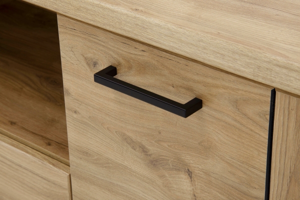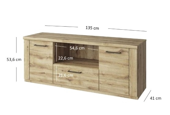 Елегантна непідвладна часу ТВ тумба 2D1S/135 Doorset Mebel Bos, яка містить одну висувну шухляду, відкриту поличку і два закрити відділення. На задній стінці шафки передбачено отвір для дротів. Тумба під телевізор привертає увагу вдалим поєднанням класики та простати виконання; теплим відтінком дуб наварра зі структурою необробленого дерева, з видимими кільцями та сучками; довгастими пластиковими ручками, чорного кольору; фірмовими комплектуючими. Завдяки меблям Дорсет Меблі Бос Ви створите затишну, домашню атмосферу – ідеальну для відпочинку та зустрічей з друзями.