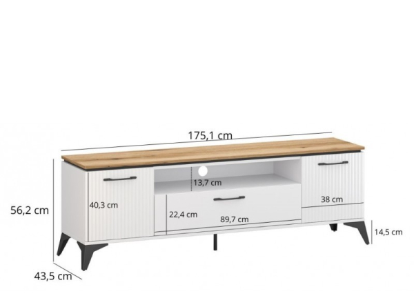 тумба містить два закритих відділення, одну висувну шухляду та відкриту поличку для техніки |