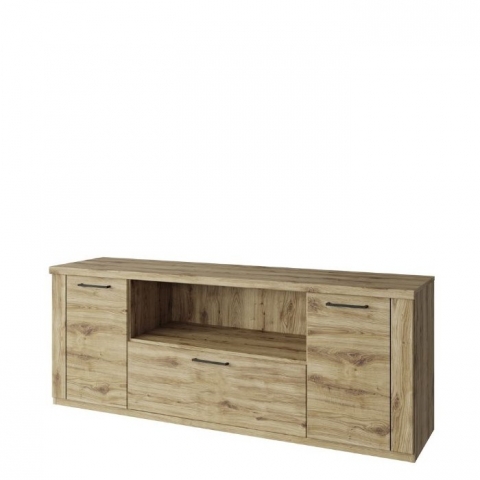 Елегантна непідвладна часу ТВ тумба 2D1S/180 Doorset Mebel Bos, яка містить одну висувну шухляду, відкриту поличку і два закрити відділення з поличкою всередині кожного. На задній стінці шафки передбачено отвір для дротів. Тумба під телевізор привертає увагу вдалим поєднанням класики та простати виконання; теплим відтінком дуб наварра зі структурою необробленого дерева, з видимими кільцями та сучками; довгастими пластиковими ручками, чорного кольору; фірмовими комплектуючими. Завдяки меблям Дорсет Меблі Бос Ви створите затишну, домашню атмосферу – ідеальну для відпочинку та зустрічей з друзями.