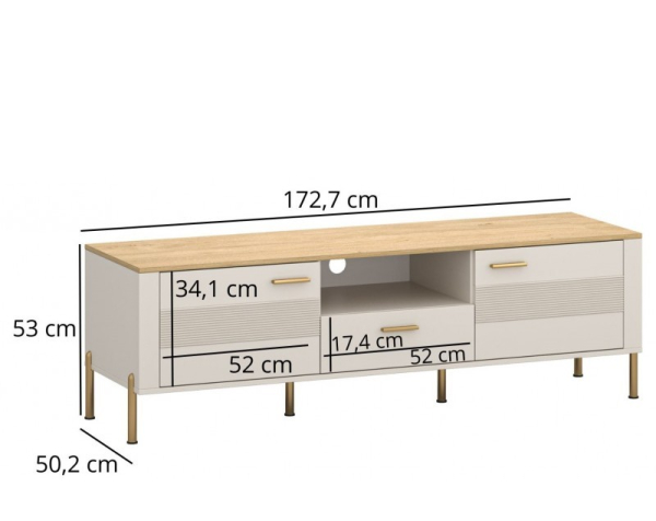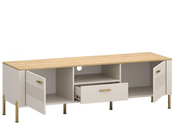ТВ тумба 2D1S Ruben Mebel Bos - симфонія витонченого стилю, розкоші та комфорту, яка додасть вітальні елегантності та гармонії, перетворюючи інтер'єр на простір мрії. Елегантна ТВ тумба обладнана двома закритими відділеннями, що ідеально підходять для зберігання різних аксесуарів, а також однією висувною шухлядою для дрібних предметів, відкрита ніша для техніки дає змогу розмістити аудіосистему або ігрові консолі, а передбачений отвір для дротів у задній стінці забезпечує акуратне розташування всіх кабелів. Колекція заворожує з першого погляду втіленням естетики та стилю: теплий відтінок «кашемір» наповнює простір відчуттям спокою й умиротворення, перетворюючи інтер'єр на оазис затишку; стільниці у відтінку «дуб кам'яний» ефектно вирізняються на світлому тлі, створюючи виразний акцент і підкреслюючи стильне подавання декору; витончені рифлені декоративні елементи надають поверхням об'єму та глибини, граючись із тінями та світлом; розкішні золотисті ручки стануть елегантною прикрасою, що підкреслює шляхетний стиль колекції; легкі й витончені ніжки золотого кольору надають конструкції легкість, зберігаючи водночас неперевершену стійкість і надійність, а високоякісна фурнітура забезпечує плавність і безшумність роботи, даруючи задоволення від кожного дотику. Ruben Mebel Bos справжній витвір мистецтва, що створює простір, в якому кожна деталь надихає, а комфорт стає мистецтвом!