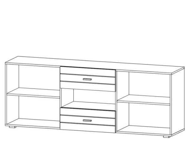 тумба містить дві висувні шухляди, відкриту нішу і два закритих відділення з поличкою всередині |