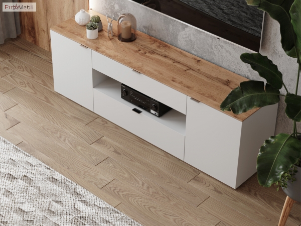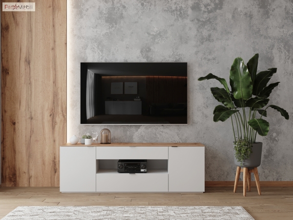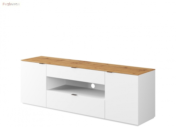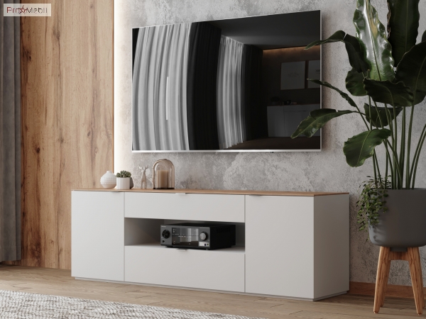 Стильна, функціональна і якісна ТВ тумба AgTv-180 Agora Botticelli популярний предмет інтер'єру. У своїй конструкції тумба має відкриту нішу, дві висувні шухляди та два закритих відділення, внутрішній простір розділено полицями з ДСП товщиною 16 мм, які регулюються по висоті. На задній стінці шафки передбачено отвір для дротів. Корпус і фасадні частини комода виготовлені з ДСП товщиною 16 мм і надалі покриті білим матовим лаком. Верхня частина корпусу - стільниця комода - виготовлена з шпонованного HDF товщиною 8 мм натурального дуба, в подальшому покрита матовим акриловим лаком. Комод Agora Botticelli привертає увагу мінімалістичним дизайном; чіткими геометричними лініями; відсутністю зайвих деталей; нержавіючими хромованими ручками; міцною підставою, що сприяє максимальній стійкості; фірмовими комплектуючими: направляючими повного висування та завісами з дотягом, які забезпечують плавне і м'яке закривання. Тумба Agora Botticelli чудово доповнить інтер'єр вітальні і стане відмінним рішенням для установки телевізора і DVD-плеєра, а також для зберігання, DVD-дисків, пульта, газет, журналів та різних побутових дрібниць, які часто потрібні під рукою.