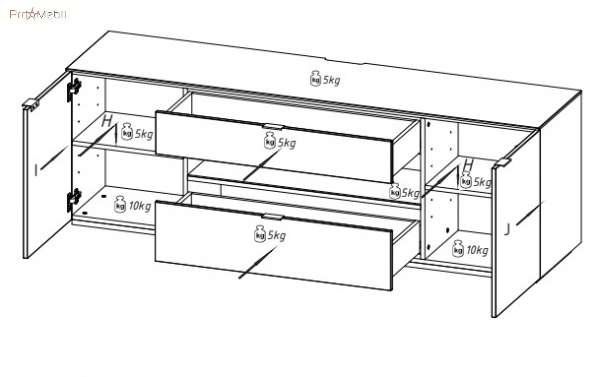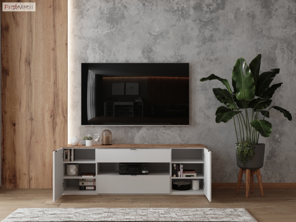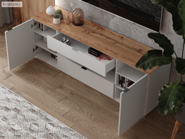 тумба містить відкриту нішу, дві висувні шухляди та два закритих відділення, внутрішній простір розділено полицями з ДСП товщиною 16 мм, які регулюються по висоті |