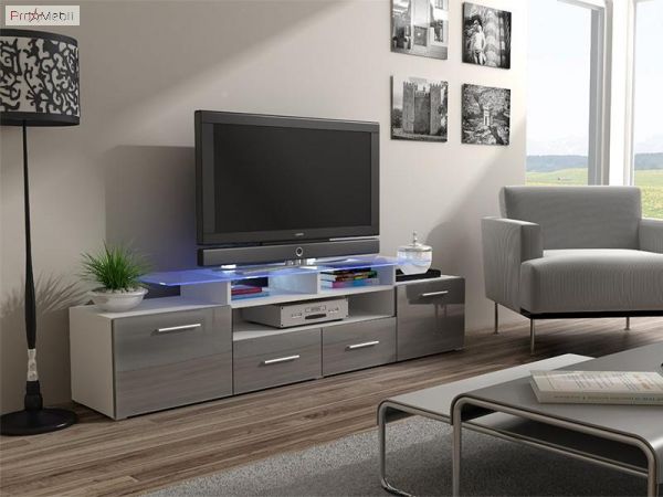 ТВ тумба Evora Cama- сучасний предмет меблів в стилів хай-тек для облаштування сучасної вітальні. Тумба складається з чотирьох висувних шухляд, для зберігання речей і трьох відкритих полиць, для аудіотехніки, DVD-плеєра та іншої телевізійної техніки, а також з стільниці виготовленої з загартованого скла товщиною 8 мм, яка може бути додатково укомплектована кольоровою LED-підсвіткою (білою, блакитною, червоною або зеленою) або кольоровим RGB-підсвічуванням (16 кольорів) з пультом управління, за допомогою якого можна змінювати кольори, в залежності від Ваших переваг на даний момент. Корпус виконаний з ДСП високої якості "білого матового" кольору. Фасади виконані з МДФ в кольорі "сірого глянцю". Характерними особливостями ТВ тумби є чіткі лінії, вишукана простота і, разом з тим, висока функціональність, стильні і зручні довгасті пластикові ручки, надійна і практична фурнітура від німецького виробника Hettich забезпечує максимально комфортне використання. Тумба під телевізор Евора Кама прикрасить собою будь-який дизайн приміщення, органічно впишеться в створений інтер'єр.