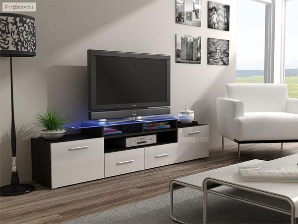 ТВ тумба Evora Cama- сучасний предмет меблів в стилів хай-тек для облаштування сучасної вітальні. Тумба складається з чотирьох висувних шухляд, для зберігання речей і трьох відкритих полиць, для аудіотехніки, DVD-плеєра та іншої телевізійної техніки, а також з стільниці виготовленої з загартованого скла товщиною 8 мм, яка може бути додатково укомплектована кольоровою LED-підсвіткою (білою, блакитною, червоною або зеленою) або кольоровим RGB-підсвічуванням (16 кольорів) з пультом управління, за допомогою якого можна змінювати кольори, в залежності від Ваших переваг на даний момент. Корпус виконаний з ДСП високої якості "чорного матового" кольору. Фасади виконані з МДФ в кольорі "білого глянцю". Характерними особливостями ТВ тумби є чіткі лінії, вишукана простота і, разом з тим, висока функціональність, стильні і зручні довгасті пластикові ручки, надійна і практична фурнітура від німецького виробника Hettich забезпечує максимально комфортне використання. Тумба під телевізор Евора Кама прикрасить собою будь-який дизайн приміщення, органічно впишеться в створений інтер'єр.