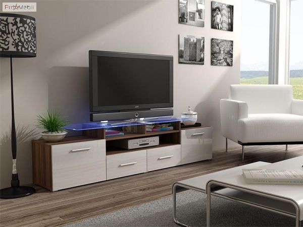 ТВ тумба Evora Cama- сучасний предмет меблів в стилів хай-тек для облаштування сучасної вітальні. Тумба складається з чотирьох висувних шухляд, для зберігання речей і трьох відкритих полиць, для аудіотехніки, DVD-плеєра та іншої телевізійної техніки, а також з стільниці виготовленої з загартованого скла товщиною 8 мм, яка може бути додатково укомплектована кольоровою LED-підсвіткою (білою, блакитною, червоною або зеленою) або кольоровим RGB-підсвічуванням (16 кольорів) з пультом управління, за допомогою якого можна змінювати кольори, в залежності від Ваших переваг на даний момент. Корпус виконаний з ДСП високої якості в насиченому кольорі "слива". Фасади виконані з МДФ у кольорі "білого глянцю". Характерними особливостями ТВ тумби є чіткі лінії, вишукана простота і, разом з тим, висока функціональність, стильні і зручні довгасті пластикові ручки, надійна і практична фурнітура від німецького виробника Hettich забезпечує максимально комфортне використання. Тумба під телевізор Евора Кама прикрасить собою будь-який дизайн приміщення, органічно впишеться в створений інтер'єр.