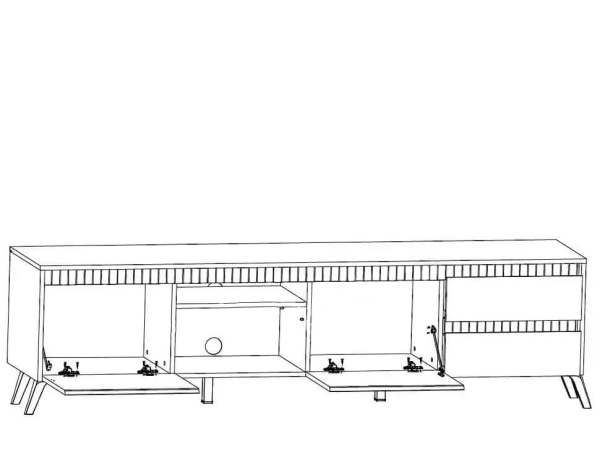 тумба містить два закритих відділення з відкидними дверима, дві висівні шухляди та дві відкриті ніші з технічними отворами для дротів у задній стінці |