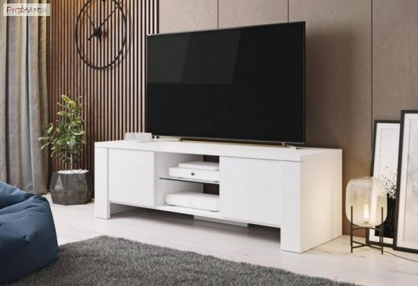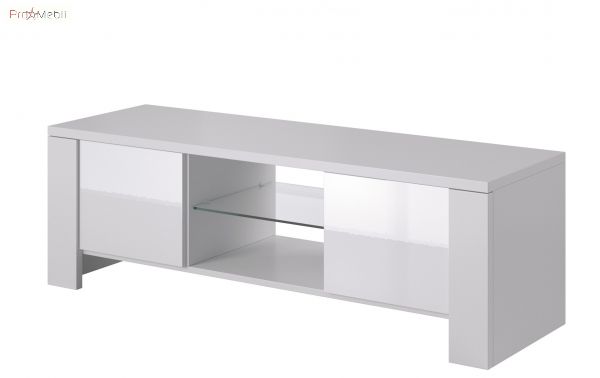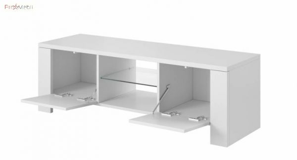 ТВ тумба West Cama- відмінний предмет для облаштування сучасної вітальні. Тумба складається з двох закритих відділень з відкидними дверцятами і ніші зі скляною полицею, яку додатково можна комплектувати кольоровою LED-підсвіткою (білою, блакитною, червоною або зеленою) або кольоровим RGB-підсвічуванням (16 кольорів) з пультом управління, за допомогою якого можна змінювати кольори, в залежно від Ваших переваг на даний момент. На широкій основі оригінальною і стильною тумби поміститися телевізор будь-діагоналі. Корпус виконаний з ДСП високої якості "білого матового" кольору. Фасади виконані з МДФ в кольорі "білого глянцю". Характерними особливостями ТВ тумби є неповторний дизайн, правильні геометричні форми, мінімальне декоративне оформлення, цікаве дизайнерське рішення: відсутність традиційних ручок, глухі фасади відкриваються легким натисканням на фасад завдяки системі Push to Open, надійна і практична фурнітура від німецького виробника Hettich забезпечує максимально комфортне використання.