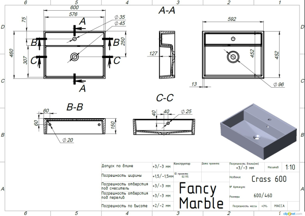 Характеристики Умивальник Crass 600 Matt Fancy Marble