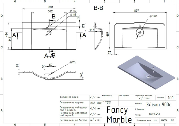 Вишуканий умивальник Edison 900C Fancy Marble ідеально впишеться в сучасний інтер'єр, поєднуючи в собі стиль, надійність і функціональність. Виготовлений із високоякісного штучного каменю, він дивує не тільки своєю естетикою, а й довговічністю. Прямокутна форма і розміри (897 мм довжина, 457 мм ширина, 140 мм висота) роблять його універсальним варіантом для меблевого монтажу. Гладка глянцева поверхня умивальника приємна на дотик, легко чиститься і стійка до температур від -60°C до +65°C, що гарантує його надійність у найрізноманітніших умовах. Глибина чаші 116 мм забезпечує комфорт під час використання, а вбудований перелив захищає від випадкових протікань. Діаметр зливного отвору 45 мм підходить для більшості стандартних систем, проте сифон у комплект не входить, залишаючи вибір за вами. Станьте володарем стильного і практичного умивальника Edison 900C, який стане не тільки функціональною частиною вашої ванної кімнати, але і її стильним акцентом!
