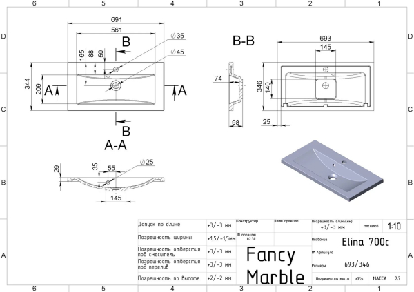 Характеристики Умивальник Elina 700 Matt Fancy Marble