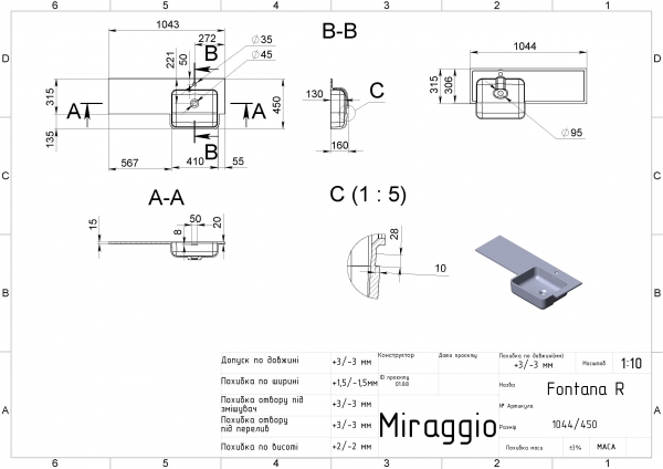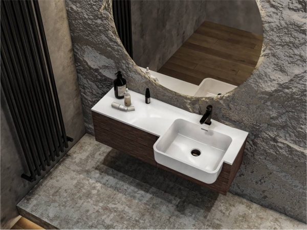 Умивальник FONTANA R MIRAGGIO практичне та гарне рішення для ванни. Прямі лінії, глибока чаша, широке крило як стільниця або кришка тумби гарантують комфорт і естетичну привабливість умивальника в будь якому інтер'єрі. Умивальник може бути встановлений накладним методом на тумбу або врізаний у полицю. Заводський стандарт моделі передбачає отвори під змішувач та перелив. Умивальник виготовлено з міцного, гарного та сучасного продукту – литого мармуру (штучного каменю) з Miramarble technology – 80% мармурової крихти та 20% полімерної смоли з домішками, зовнішня поверхня виробу покрита антибактеріальним гелем Gelcoat ISO NPG, який захищає виріб від бактерій та механічних пошкоджень. На кінцевому етапі полірується спеціальною пастою для отримання блискучої глянсової поверхні. Литий мармур відрізняється здатністю поглинати звуки води та приймати температуру довкілля, завдяки цьому умивальник безшумний, зручний та надійний. Умивальник у ванній кімнаті може бути не просто функціональним предметом, а й стильним аксесуаром. Ексклюзивна сантехніка MIRAGGIO - вражає своїм неперевершеним дизайном, передовими технологіями та бездоганною якістю, де кожен елемент створений для того, щоб забезпечити Вам комфорт, естетику та незабутній досвід використання.