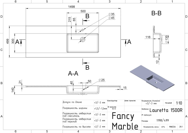 Характеристики Умивальник Lauretta 1500 R Matt Fancy Marble