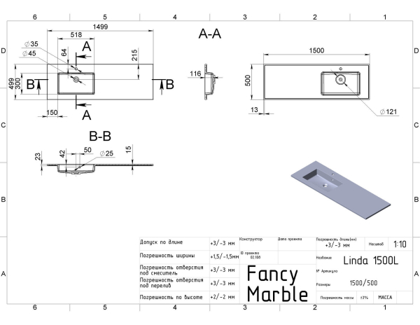 Характеристики Умивальник Linda 1500 L Matt Fancy Marble
